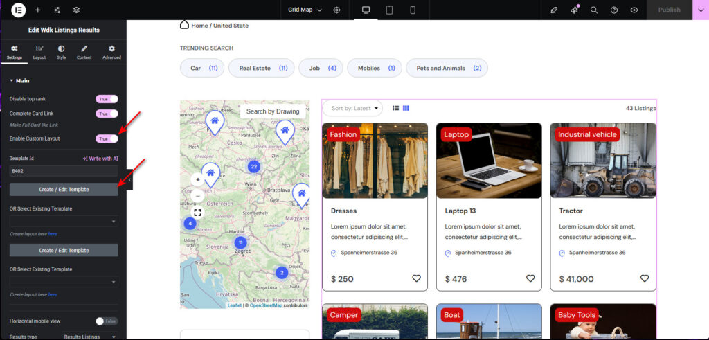Open the Elementor Builder, select Wdk Listings Results, and enable the “Custom Layout” option.