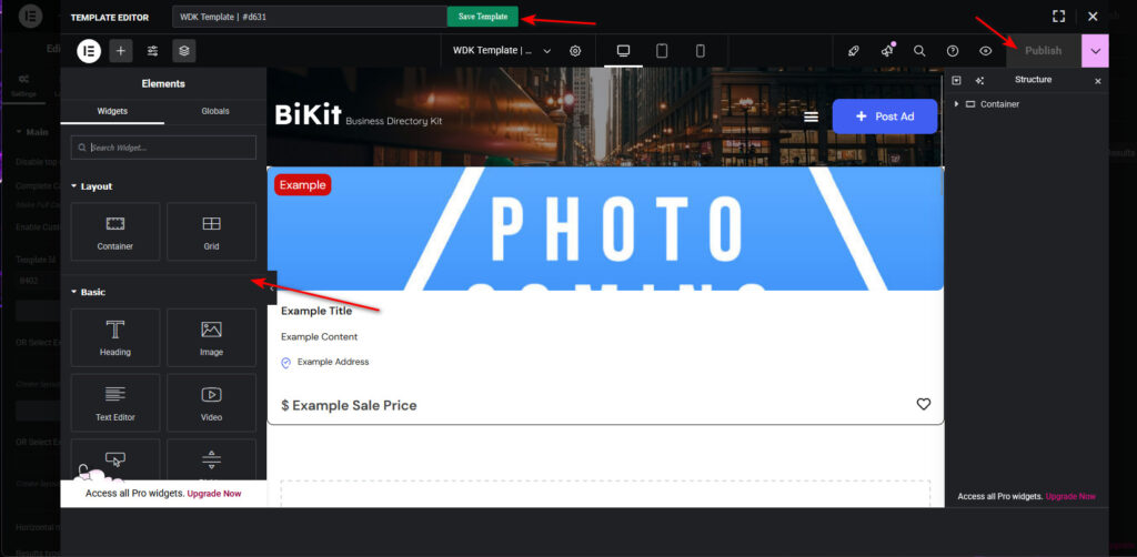 Click the “Create Template” button. In the editor window, use standard Elementor widgets along with the special elements provided by the WPDirectoryKit plugin to build your unique design.